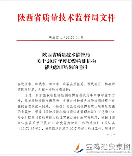 2017年12月14日從陜西省質(zhì)量技術(shù)監(jiān)督局文件獲悉,我公司參與省局組織開展的2017年能力驗證的兩個項目順利通過。截止目前,我公司已參與本年度能力驗證項目為四項,結(jié)果均為“滿意”,此結(jié)果意味著2年時間內(nèi)我們在接受省局資質(zhì)認評評審時可免于此四個項目的現(xiàn)場試驗,并作為政府部門安排檢測任務(wù)時優(yōu)先考慮的機構(gòu)。